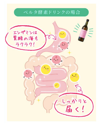 しかし、ベルタ酵素ドリンクでは熱に強い「エンザミン」が配合。熱から酵素を守ってくれるという特徴を活かすことで、腸に生きたまま酵素を送り届けることができるんです。